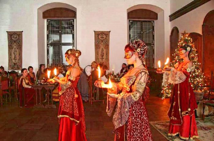 celebration could be arranged in costumes. The guests take a seat at a richly-laden medieval table lined with candles, and enjoy the good life with excellent food with Roasted piglet sliced in front of the guests and drink at a real Renaissance Feast.