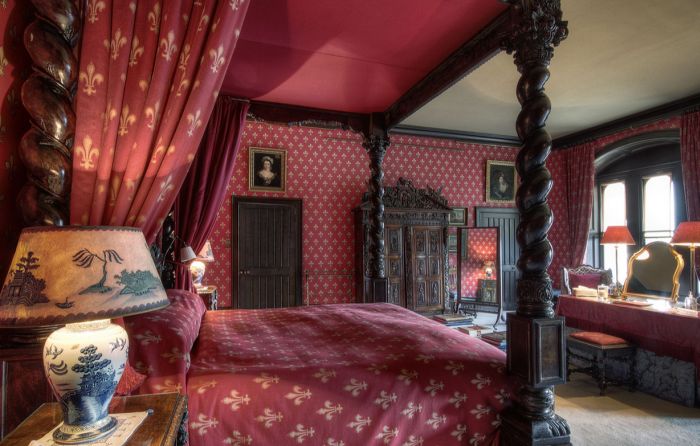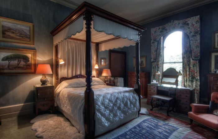 This was the 3rd Earl’s bedroom and is hung with panels from the Royal School of Needlework. The large altarpiece with tabernacle over the wardrobe is partly by Ridolfo di Ghirlandaio. The Last Supper is from the studio of Jacopo Bassano and The Baptism of Christ over the entrance by a follower of Tintoretto. The bed is Italian and belonged to Cardinal (now Saint Robert) Bellarmine (17th century). The wardrobe and chest of drawers are 17th century Genoese. The Latin motto of the Cocks family, “Spes nescia vinci” on the chimney piece means: “Hope knows no defeat”.