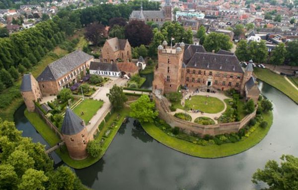 Medieval Huis Bergh castle is surrounded by a moat and half of it is enclosed by an embankment.