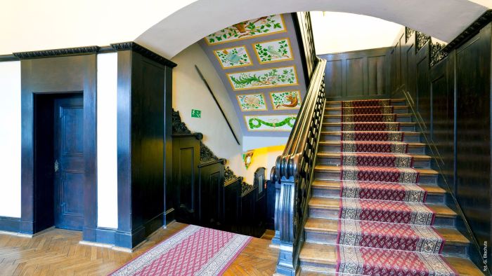 The castle may be accessed through a gate with an early Baroque portal decorated with cartouches with coats of arms and a sculpture presenting a swordsman, which is dwarfed by a round tower with a wooden coping.