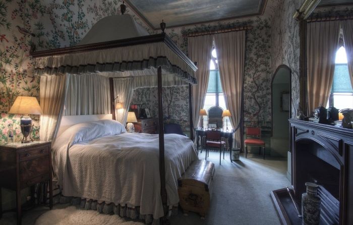This was the 3rd Earl’s bedroom and is hung with panels from the Royal School of Needlework. The large altarpiece with tabernacle over the wardrobe is partly by Ridolfo di Ghirlandaio. The Last Supper is from the studio of Jacopo Bassano and The Baptism of Christ over the entrance by a follower of Tintoretto. The bed is Italian and belonged to Cardinal (now Saint Robert) Bellarmine (17th century). The wardrobe and chest of drawers are 17th century Genoese. The Latin motto of the Cocks family, “Spes nescia vinci” on the chimney piece means: “Hope knows no defeat”.