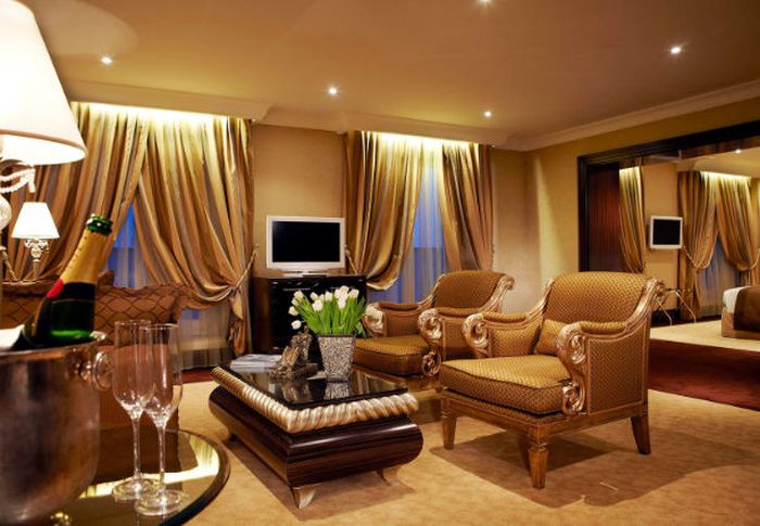 Two royal suites, 135 m² and 142 m² respectively, compose this large residence. One room is dominated by the colour blue, with a large and light-filled bathroom, while the other is red, with truly splendid mosaic finishes. A shared lobby links the right and left wing, which can also be used separately. Precious fabrics and original details, from the silk wallpaper to the Murano candelabras decorated with handmade glass: everything is a reflection of elegance.