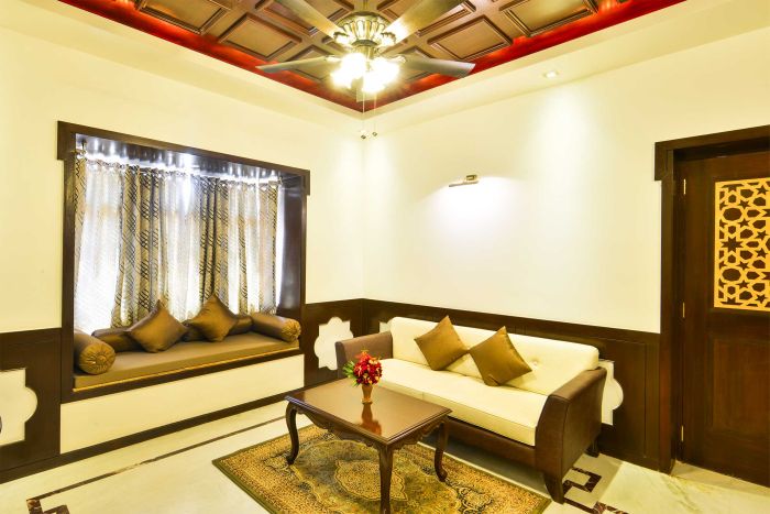 The massive 1200 sqm Ft. Apartment suites are named after traditional Rajasthani musical instruments; EIK TAARA, MANJEERA, ALGOZA and KARTAAL. The Jharokha style windows in each room give the view of the expansive lawns of Lehriya, the courtyard with the swimming pool. All 4 suites have a living room, bar area, bedroom with Jacuzzi and TV and a second bedroom with walk-in shower. Both rooms also have walk-in wardrobes. The additional bedroom has an option for two single beds. Suites also include flat-screen LCD televisions with satellite TV, WiFi Internet access, dual-line telephones, minibars, electronic safes, tea and coffee makers, and an iron and ironing board.