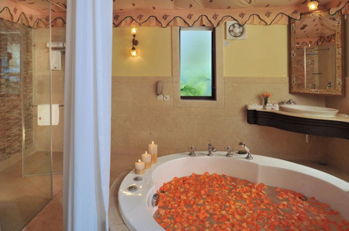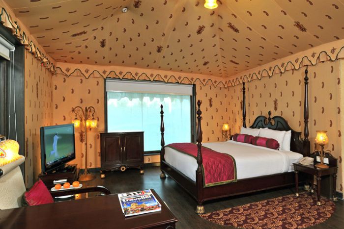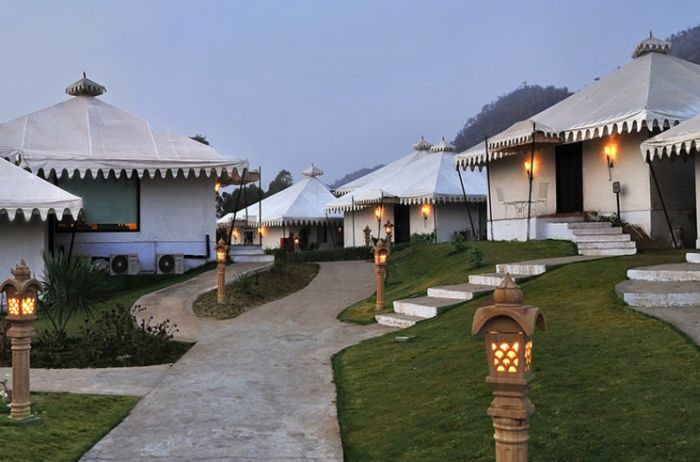Facilities at Rajasthali Resort & Spa include luxurious rooms with luxurious rooms and luxurious tapestries, royal furniture and king beds. Each of the tents has a safe, large LCD TV, Wi-Fi, mini bar, seating area and private jacuzzi. There is also a private seating for those who yearn for romantic moments.
