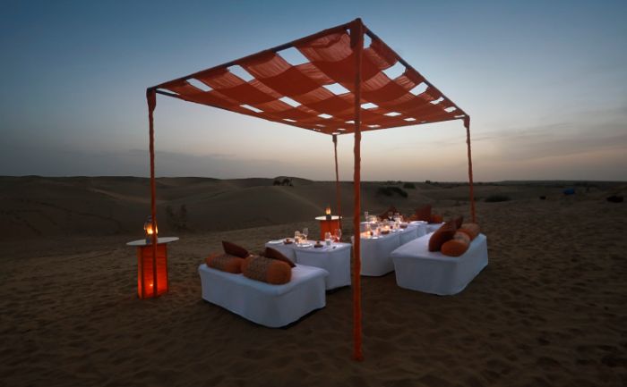 The Thar Dinner plays homage to the culinary traditions of travellers who crossed the Thar to Jaisalmer. The Thar Dinner represents the end of this journey in a celebratory feast that is served to you in a communal setting. Starry skies, tasselled canopies and mattress style seating make this a most comfortable, enjoyable dining experience.