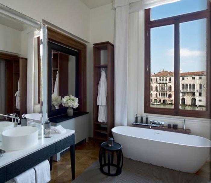Aman Canal Grande Venice offers 24 suites, some featuring protected frescos and views of the canal. The Alcova Tiepolo Suite has a Chinese painted sitting room and a bedroom ceiling by Giovanni Battista Tiepolo. Tiepolo has been described as the “greatest decorative painter of 18th-century Europe.
