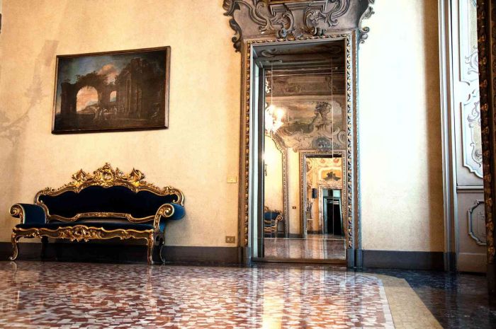 The Palazzo Visconti ballroom, the result of a renovation of the entire building commissioned by the Duke Giuseppe Visconti di Modrone and entrusted to architect Alfredo Campanini, who chose the Neo-Baroque style for this setting, is decorated with stuccoes, paintings and frescoes in the early twentieth century.