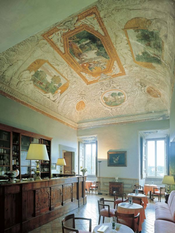 The vault of the Eliseo room - where the bar Villa is situated - is decorated with a reproduction of monochromatic stuccos masterly shaded. The stuccos enclose a central painting with a pure gold frame. The painting depicts Eliseo who contemplate Elijah the Prophet on a flaming chariot ascending to heaven.