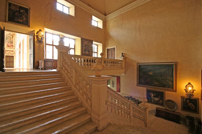 The splendid hall frescoed by Ludovico Dorigny (1654-1742) where "the pictorial fantasy of Dorigny left us one of his most grandiose and representative works" (Viviani 1975), depicting mythological scenes Perseus and the Medusa, the fight between the Centaurs and of the Lapiths, the titans that support the zodiacal signs.