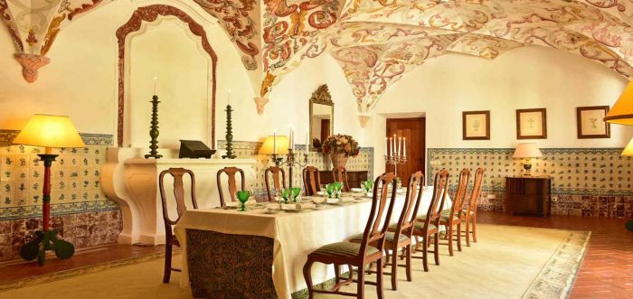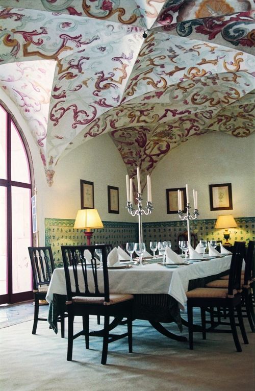 The D. Carlos restaurant has a welcoming atmosphere which is provided by a wooden ceiling and large windows facing a courtyard of pomegranates.